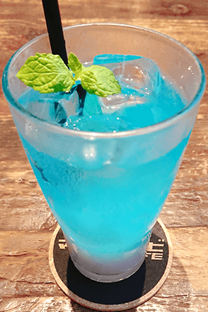 バイオレットとブルーキュラソーの涼しげな色合いにすっきりとした炭酸で、美遊をイメージしたドリンクです。