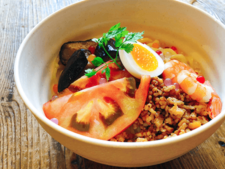 エビ・トマト・ナスや、色とりどりの海藻ビーズで、イリヤ美遊クロエ3人をイメージした夏にぴったりの特製冷やし中華です。ピリッと辛い麻婆味の鶏そぼろと一緒に混ぜてお召し上がりください。