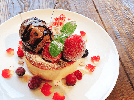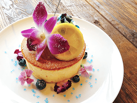 ブルーベリーと華やかなお花で、美遊をイメージしたパンケーキです。レモンやブラックベリーをトッピングし、さっぱりとした味わいに仕上げました。