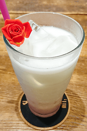 ミルクをベースに甘酸っぱいピーチとほんのり香るお花のシロップで、イリヤをイメージしたドリンクです。